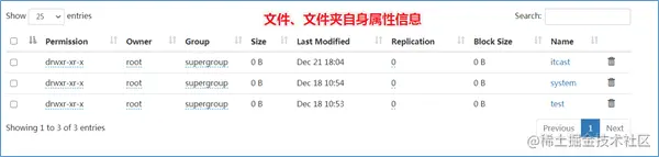文件名称、权限,修改时间,文件大小,复制因子,数据块大小。
