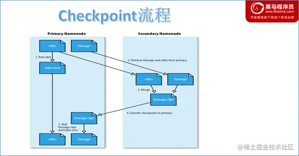 Checkpoint核心是把fsimage与edits log合并以生成新的fsimage的过程。此过程有两个好处:fsimage版本不断更新不会太旧、edits log文件不会太大。