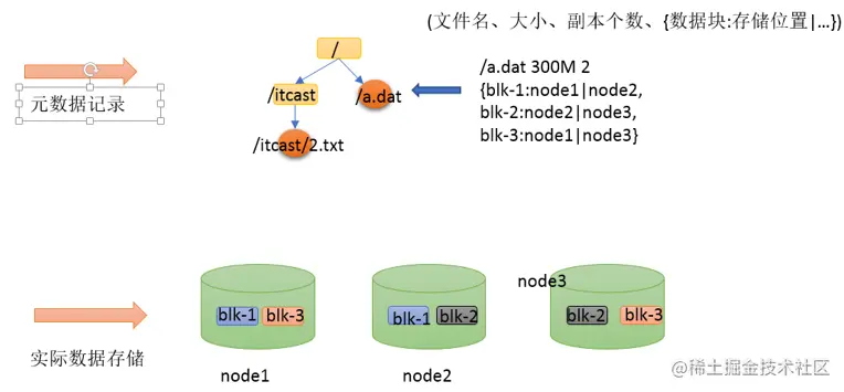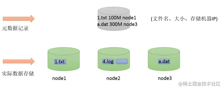 当文件被分布式存储在多台机器之后,后续获取文件的时候如何能快速找到文件位于哪台机器上呢。一台一台查询过来也不靠谱。因此可以借助于元数据记录来解决这个问题。把文件和其存储的机器的位置信息记录下来,类似于图书馆查阅图书系统,这样就可以快速定位文件存储在哪一台机器上了。