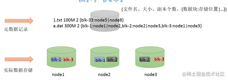 此外分块存储还可以解决数据存储负载均衡问题。此时元数据记录信息也应该更加详细:文件分了几块,分别位于哪些机器上。