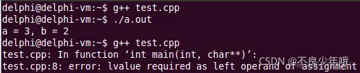 下面为输出结果,可以看到上面的程序在C语言的编译条件下编译不通过,而在C++的编译条件下编译通过, 这说明在(a < b ? a : b)代码中,因为a < b ,所以输出a的值,然后把3赋值给a。