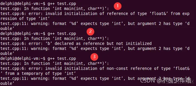 如果我们把 int& b = a; 改成 float& b = a; 或者改成 float& b; 或者改成 float& b = 1,则编译器分别报如下错误,这说明C++编译器对数据类型要求是非常严格的。