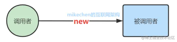 当某个Java对象(调用者)需要调用另一个Java对象(被调用者,即被依赖对象)时,在传统模式下,调用者通常会采用“new 被调用者”的代码方式来创建对象,如图所示: