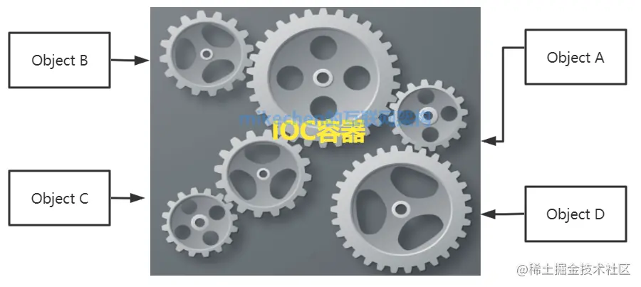 上图引入了IOC容器,使得A、B、C、D这4个对象没有了耦合关系,齿轮之间的传动全部依靠“第三方”了,全部对象的控制权全部上缴给“第三方”IOC容器。