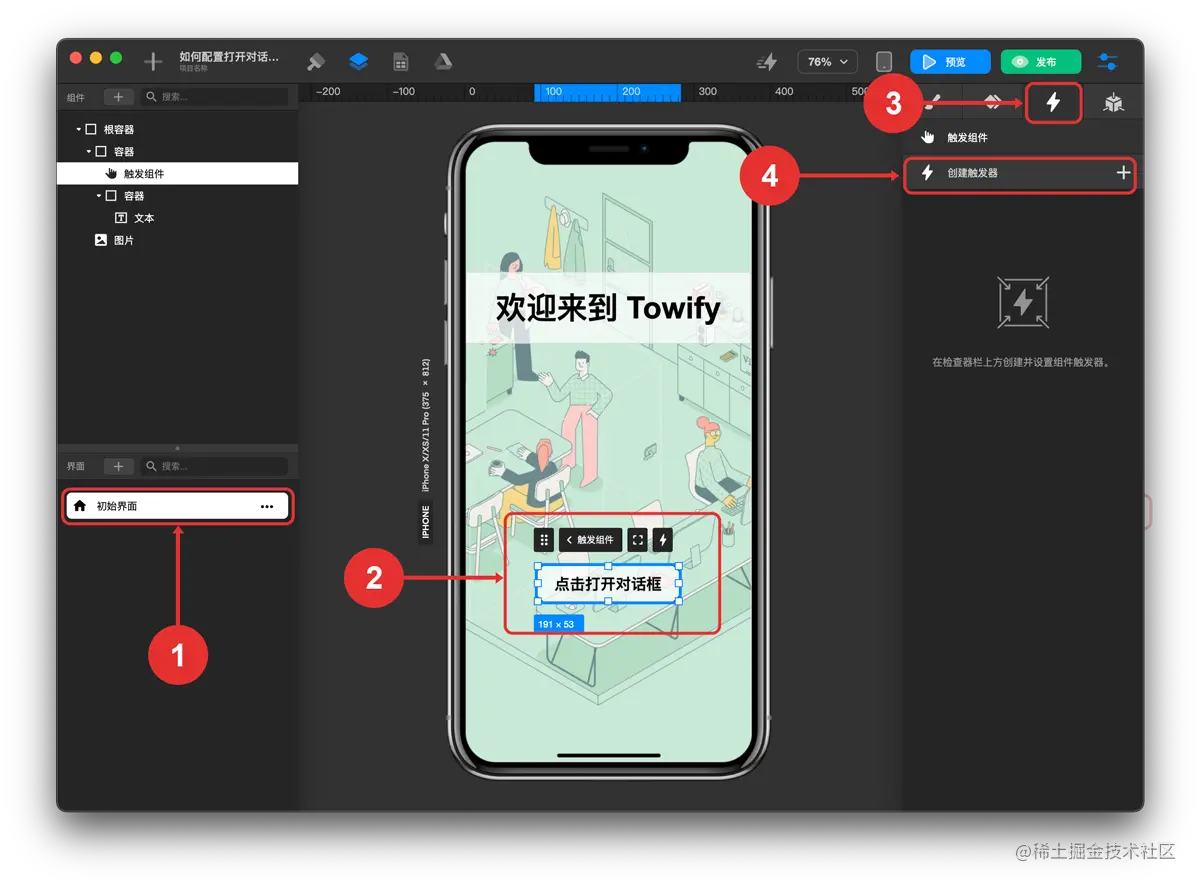 - 点击右侧 检查器 面板的 触发器 图标