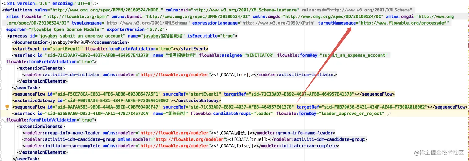 另外,该表中有一个 CATEGORY_ 的字段,这个字段表示流程的分类,注意这个和部署的分类可不一样,流程部署的分类参数第二小节的代码,流程的分类,说白了其实就是我们流程定义 XML 文件中的 targetNamespace 属性,如下图: