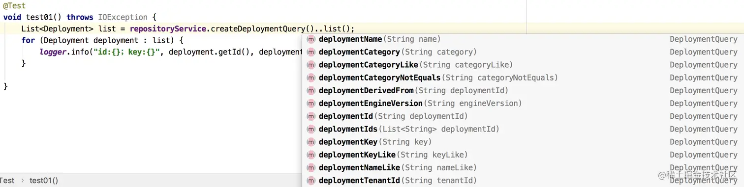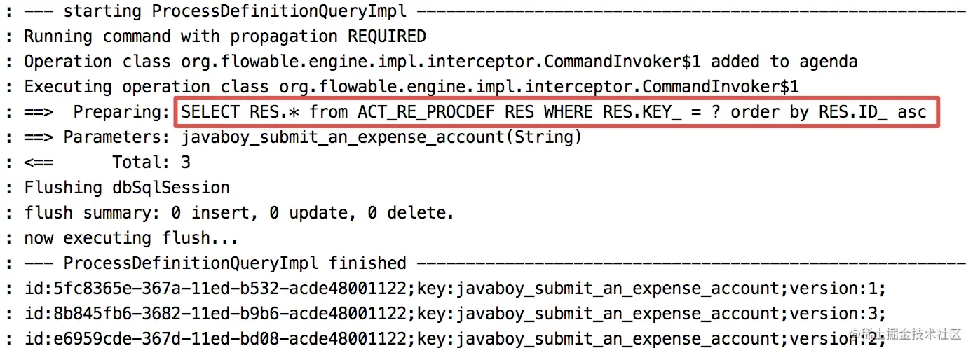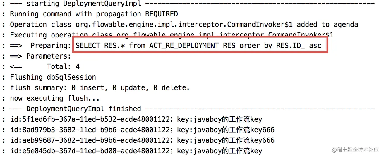 创建一个查询器,然后返回所有的流程部署信息并打印出来,我们看下此时 IDEA 控制台打印出来的 SQL 信息: