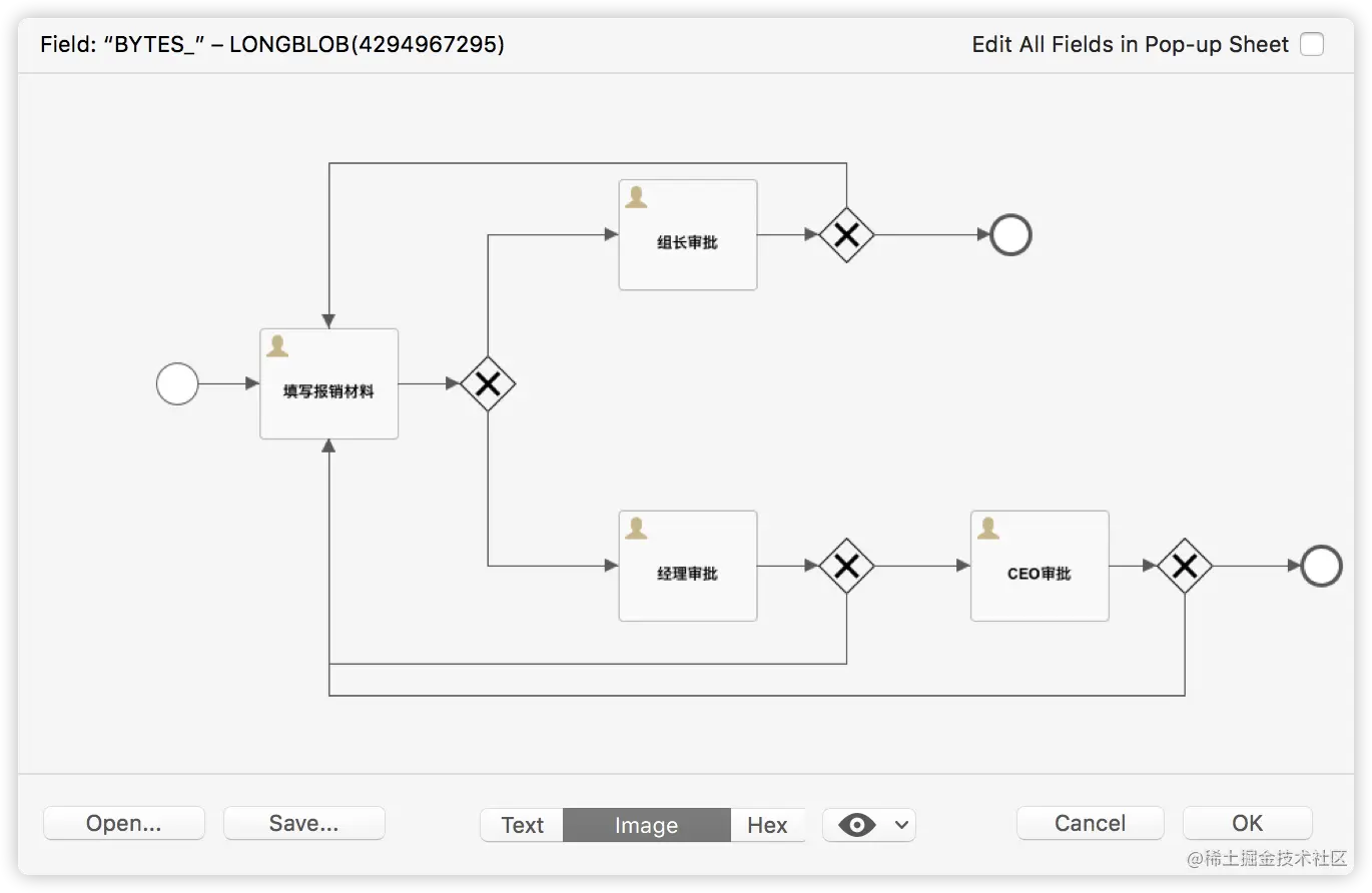 这个表中有一个 BYTES_ 字段,我们部署的流程的 XML 文件就保存在这里,同时,系统默认还会根据 XML 文件生成一张流程图片,也保存在这里,图片就像下面这种: