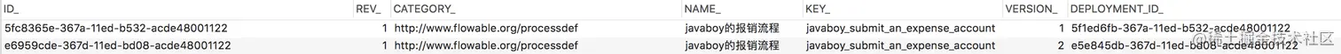 这个表是流程部署表,每部署一个流程,这张表中就会新增一条记录,用来描述我们刚刚定义好的流程: