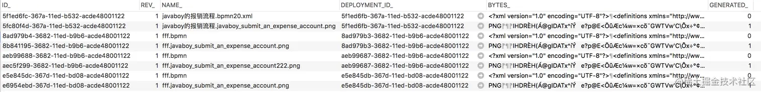 所以一个流程部署,在这张表中对应两条记录,一条记录 XML 文件,一条记录流程图片。