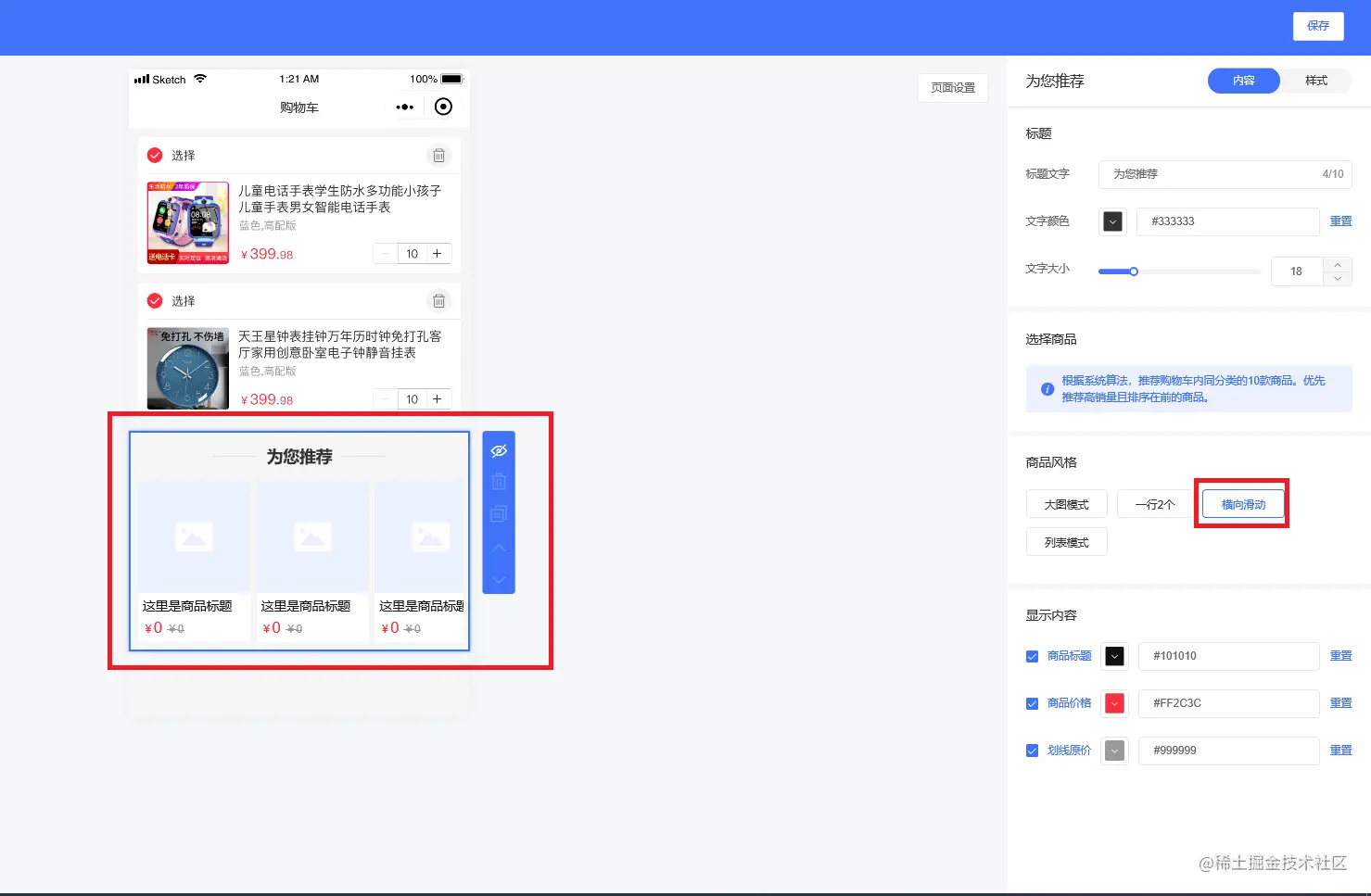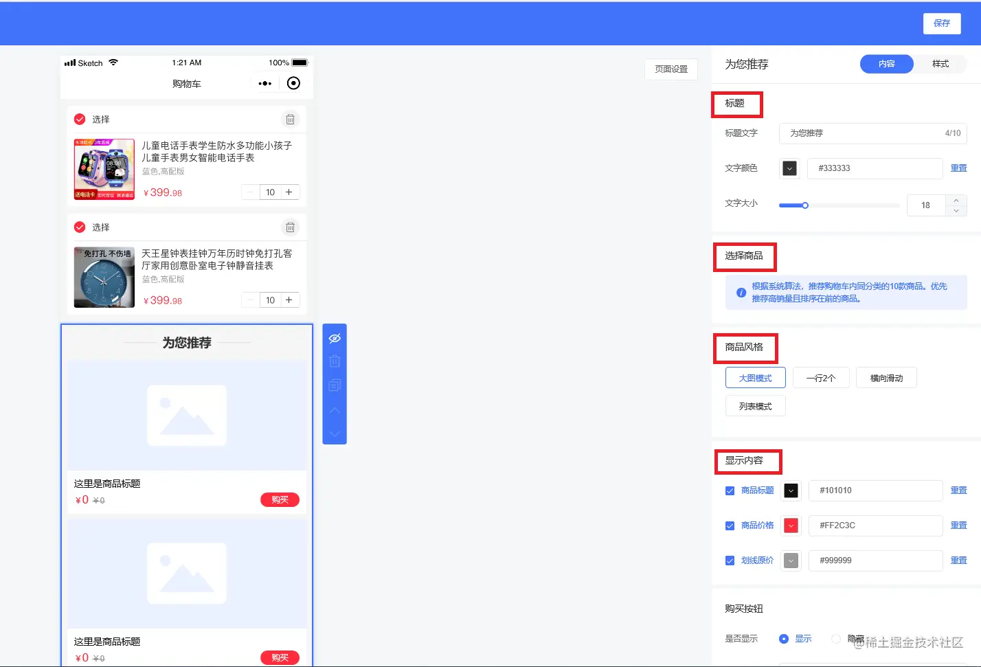 内容设置有标题、选择商品、商品风格、显示内容等设置,如下图所示: