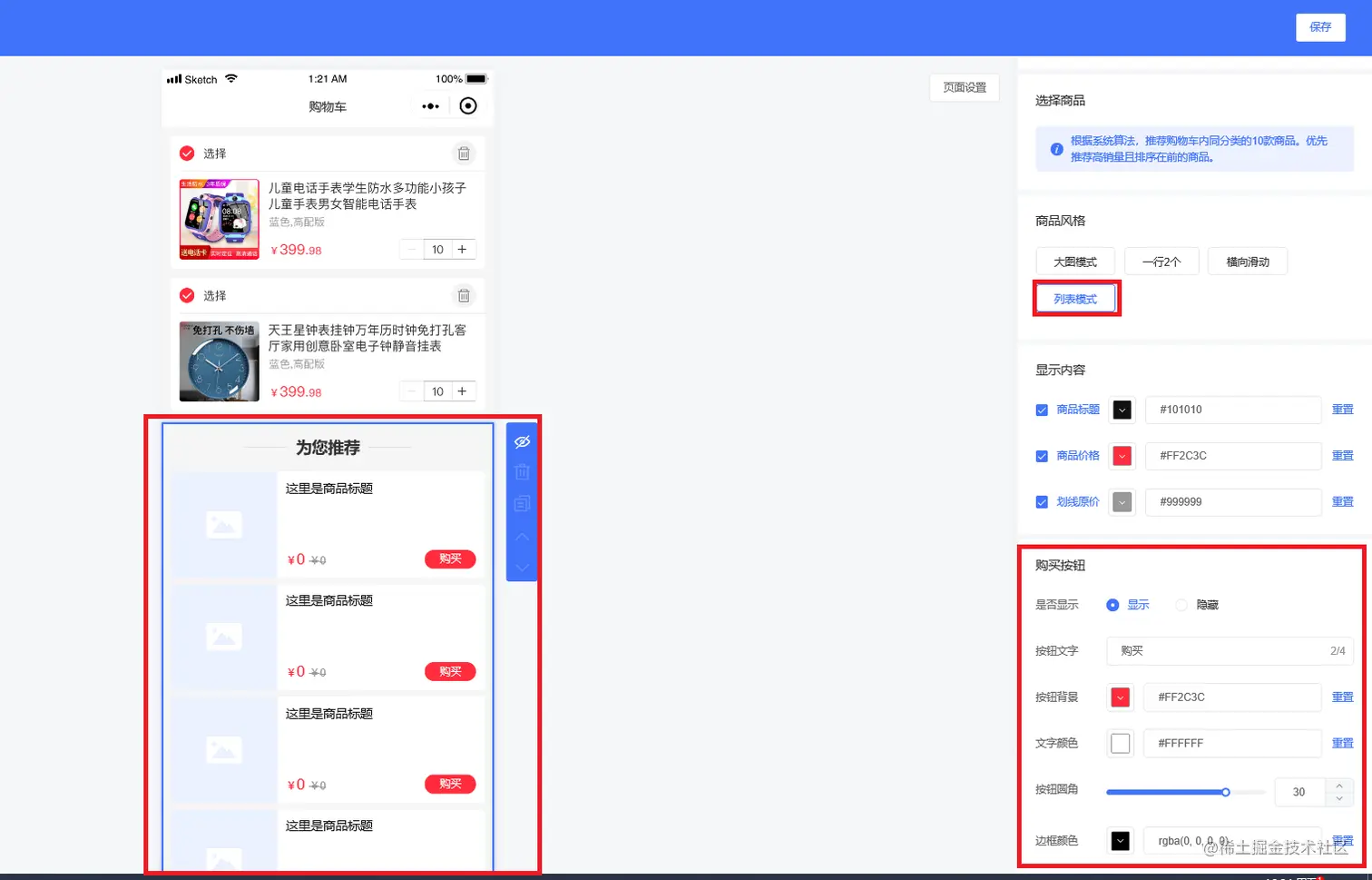 商品风格有大图模式、一行2个、横向滑动、列表模式等,其中大图模式与列表模式,多了一个购买按钮设置的内容,如下图所示:
