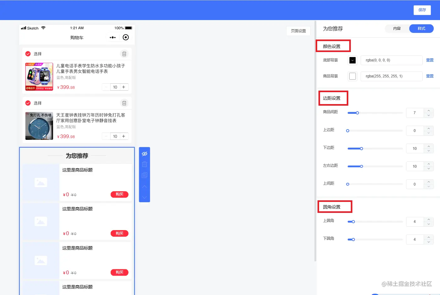 样式设置有颜色设置、边距设置、圆角设置等,如下图所示: