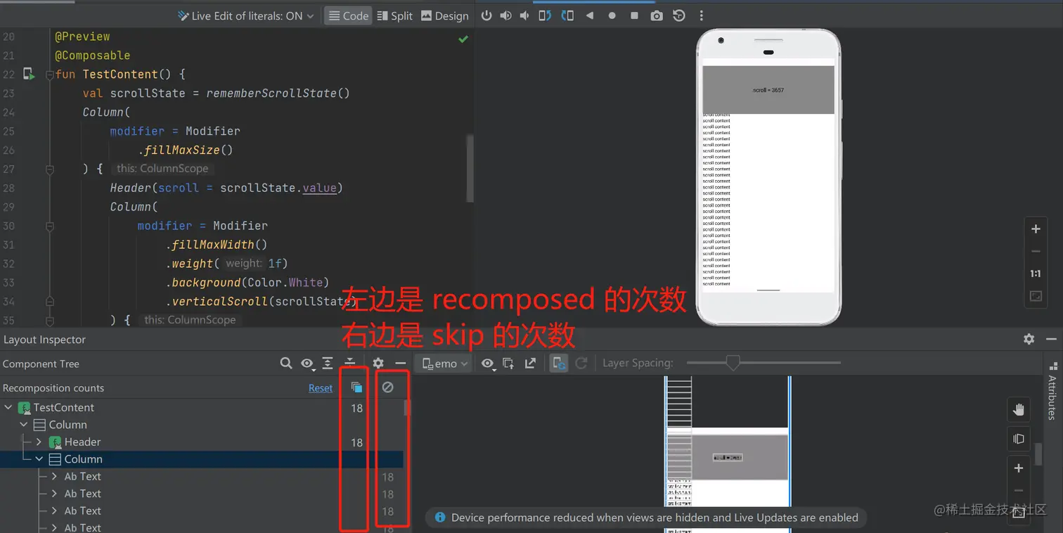 可以通过 Layout Inspector 看到在我滚动的过程中, TestContent 被 recomposed 了 18 次, 而滚动容器下都显示 skip 了 18 次,这是说循环都跑了,但是每个循环里的 Text 参数一致,所以忽略了,这也是框架已有的优化。