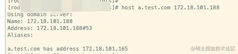 使用命令host a.test.com 172.18.101.188 验证,得到预期结果: