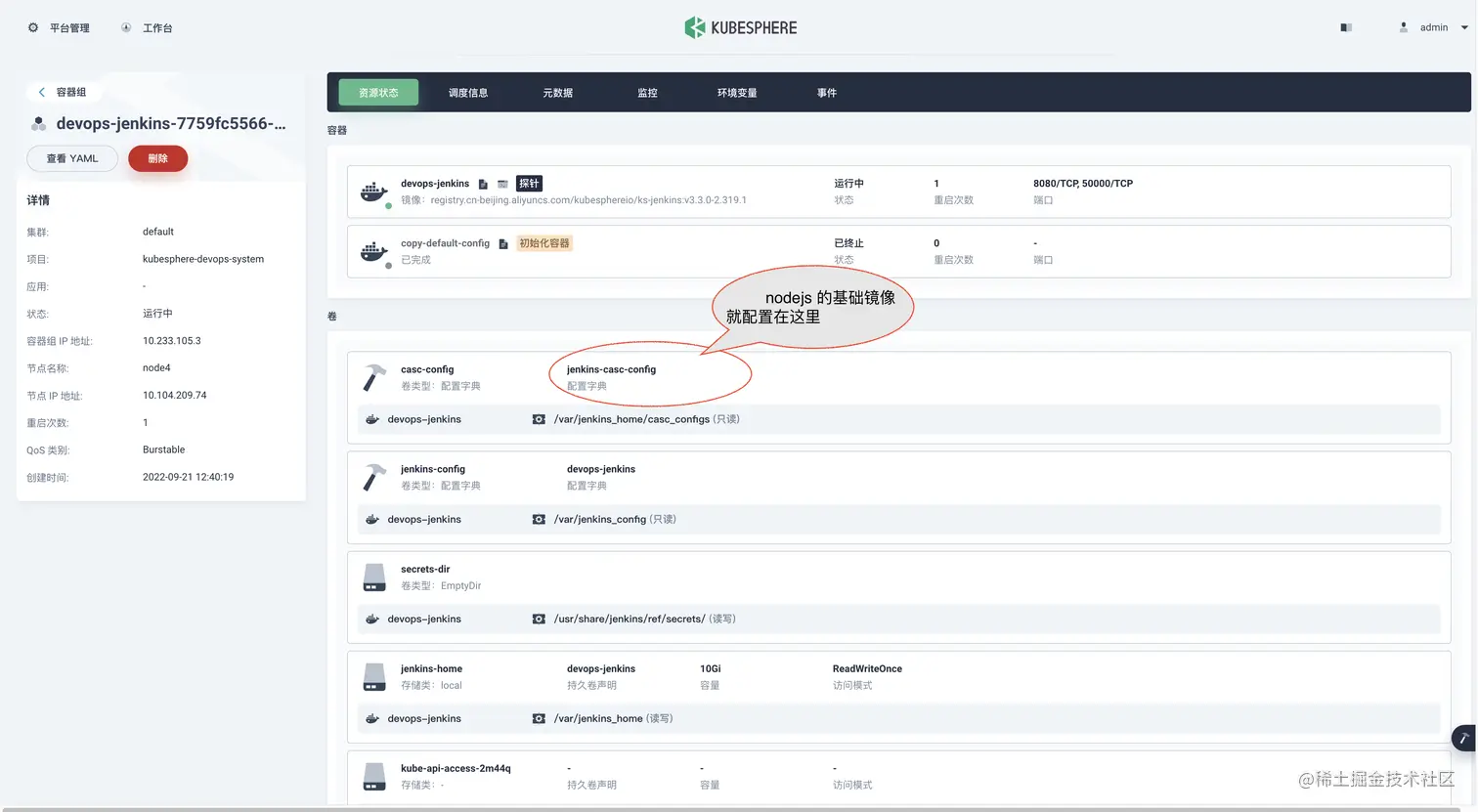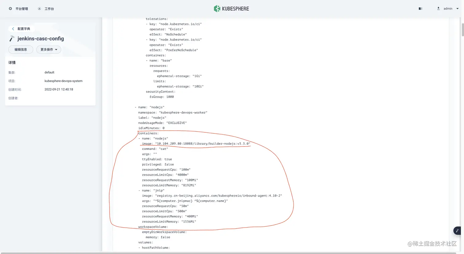 注意啊这里是有两个配置文件 jenkins.yaml 和 jenkins_user.yaml所以他有两个地方配置了 registry.cn-beijing.aliyuncs.com/kubesphereio/builder-nodejs:v3.2.0截图里是我已经更改好的配置