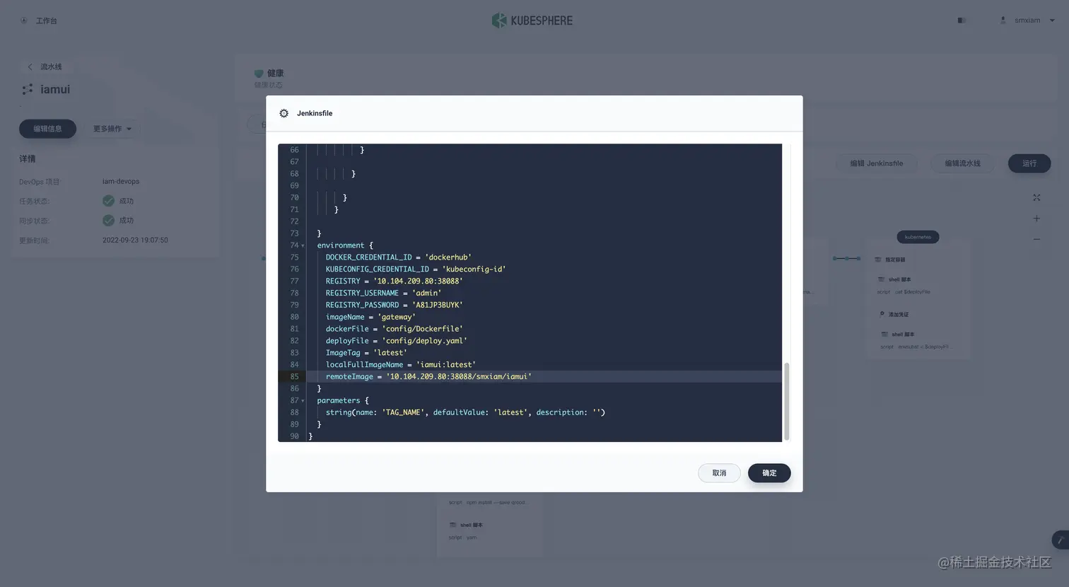 remoteImage = '10.104.209.80:38088/smxiam/iamui' # docker镜像仓库地址 + 项目名