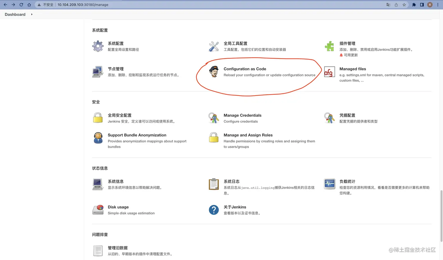 - 登录到页面 选择左侧菜单的 系统管理 -> 然后选择 configuration-as-code 图二红圈