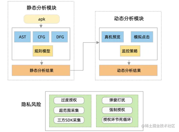 合规检测的另一个问题是,我们如何判断实际运行的采集行为与隐私政策声明一致。EMAS合规检测产品服务底层集成的隐私合规检测引擎基于控制流、数据流、污点分析、动态沙箱等动静态分析技术,深度融合隐私专家经验,提供了准确的代码层实质合规检测能力。