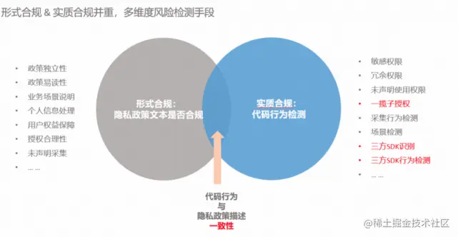 实质合规关注敏感权限调用、数据采集、数据传输、数据存储等APP实际数据使用行为,通过静态分析和动态分析两种分析引擎,基于抽象语法树、控制流图、数据流图,刻画App代码控制链路和数据流转链路,结合真机预览及模拟点击的动态分析结果,产出具体的实质合规检测点检测结果,包括敏感数据泄露、超范围采集、弹窗打扰等。相关隐私政策点击:EMAS隐私权政策,该隐私政策适用于移动推送/HTTPDNS/移动热修复/远程日志/崩溃分析/性能分析/移动用户反馈等EMAS全平台产品。