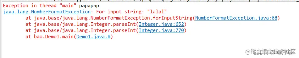 异常产生后,如果不做任何处理,程序就会被终止。例如,将一个字符串转换为整型,可以通过Integer类的parseInt()方法来实现。