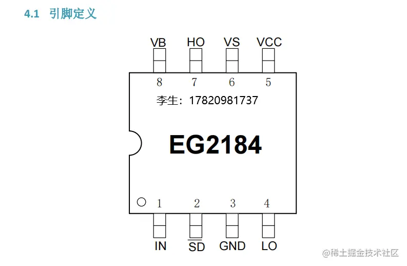 EG2184 的工作电压可达 600V,低端 VCC 的电源电压范围宽 10V~20V。该芯片输入通道 IN 内 建了一个 200K 下拉电阻,SD����内建了一个 200K 下拉电阻,在输入悬空时使上、下功率 MOS 管处于关闭状 态,输出电流能力 IO+/- 1.9/2.3A,采用 SOP8 封装。