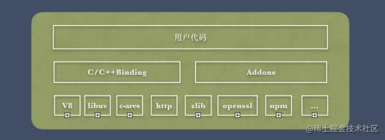 用户代码即我们编写的应用程序代码、npm包、nodejs内置的js模块等,我们日常工作中的大部分时间都是编写这个层面的代码。