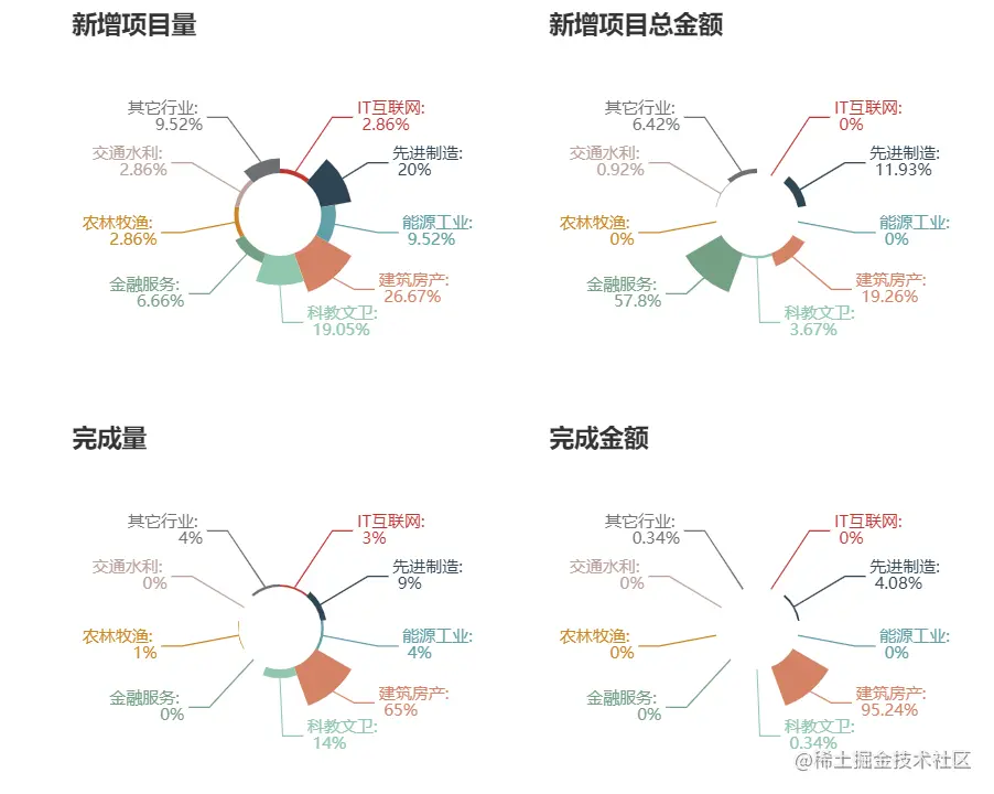 塔米周报按照行业对新增项目量、新增项目总金额、完成项目量、完成项目金额进行了统计并可视化展示。