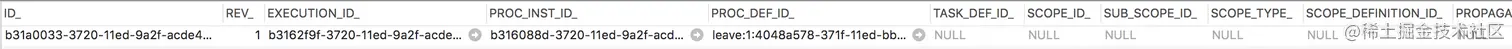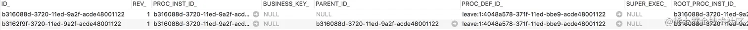 从这两张表中我们也可以大致上看出来,EXECUTION 和 ProcessInstance 之间的关系,ACT_RU_EXECUTION 表中的每一条记录就是一个 EXECUTION,多个 EXECUTION 对应同一个 PROC_INST_ID_,而 ACT_RU_TASK 表中的每一条 Task 记录也都对应了一个 EXECUTION。
