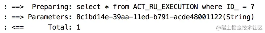 : ==> Preparing: SELECT RES.* , P.KEY_ as ProcessDefinitionKey, P.ID_ as ProcessDefinitionId, P.NAME_ as ProcessDefinitionName, P.VERSION_ as ProcessDefinitionVersion, P.DEPLOYMENT_ID_ as DeploymentId from ACT_RU_EXECUTION RES inner join ACT_RE_PROCDEF P on RES.PROC_DEF_ID_ = P.ID_ WHERE RES.PROC_INST_ID_ = ? order by RES.ID_ asc