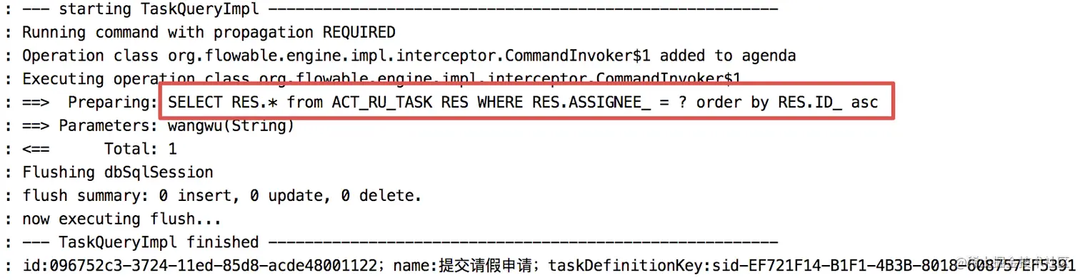 根据前面的介绍,我们知道,这个查询肯定是去 ACT_RU_TASK 表中进行查询的,我们来看下执行的 SQL:
