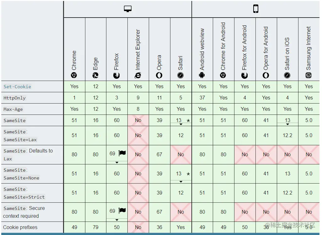 SameSite存在一定的兼容性问题,因为它是一个新的Cookie标准,有些古老的浏览器是没有实现这个特性的,如IE浏览器需要Windows 10 RS3 及之后版本才有这个特性。相关兼容性如下图: