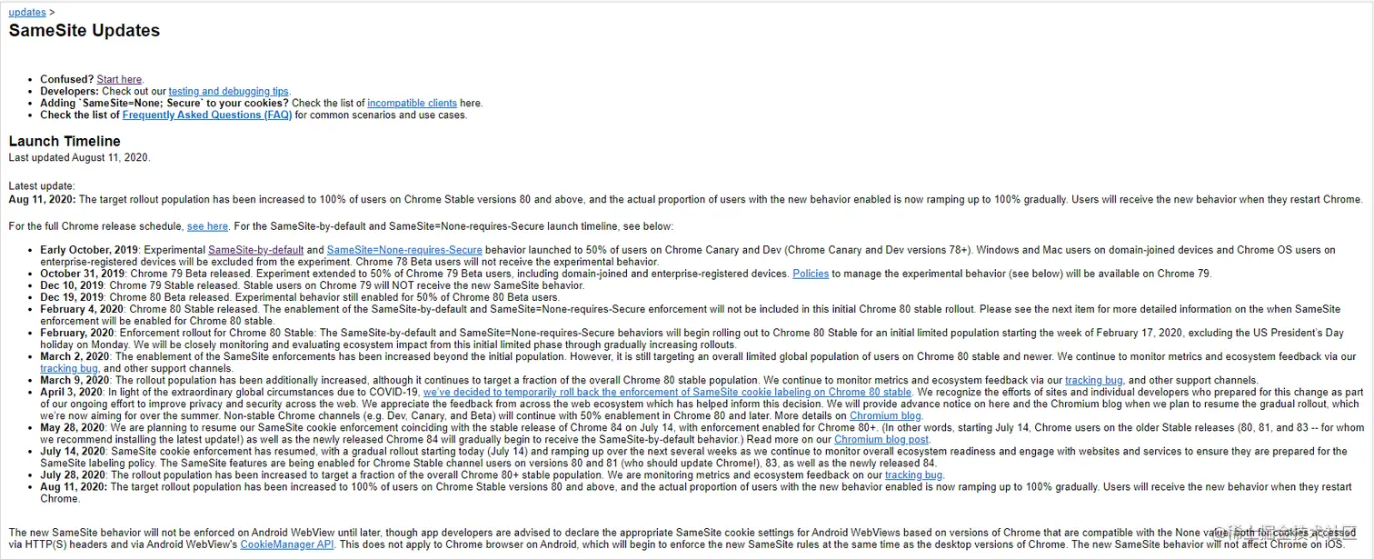有些浏览器在较早的版本就支持了该属性,但是做了循序渐进的处理。如Chrome,其下有很多广告的业务,为了给自己整改的机会,先是在80版本之前将SameSite的属性默认设置成None,防止广告机制立即失效,然后就是80版本SameSite设置的默认值改成Lax,中性处理。
