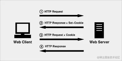 图示流程,服务端通过Response Headers中的Set-Cookie字段将Cookie存储在客户端。客户端再次请求同一个服务的时候会将前面设置的Cookie携带在Request Headers的Cookie字段中(这一行为是浏览器默认行为),服务端收到请求后解析Headers中的Cookie字段即可获取对应Cookie。