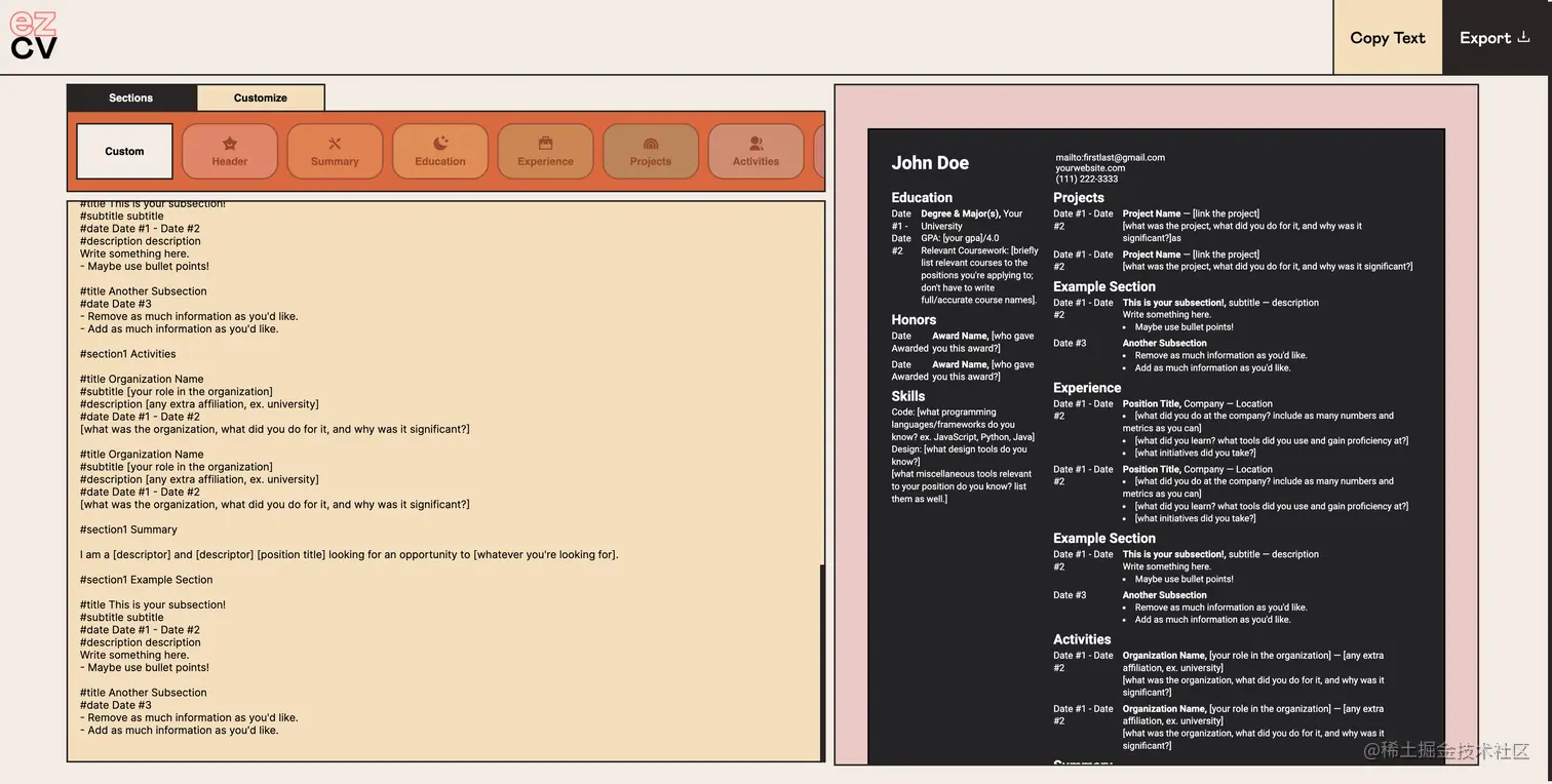 - ezcv - 这是一个在线制作简历的网站,非常简洁好用,默认了一些常用的排版,用最简单的样式展示你的简历内容。