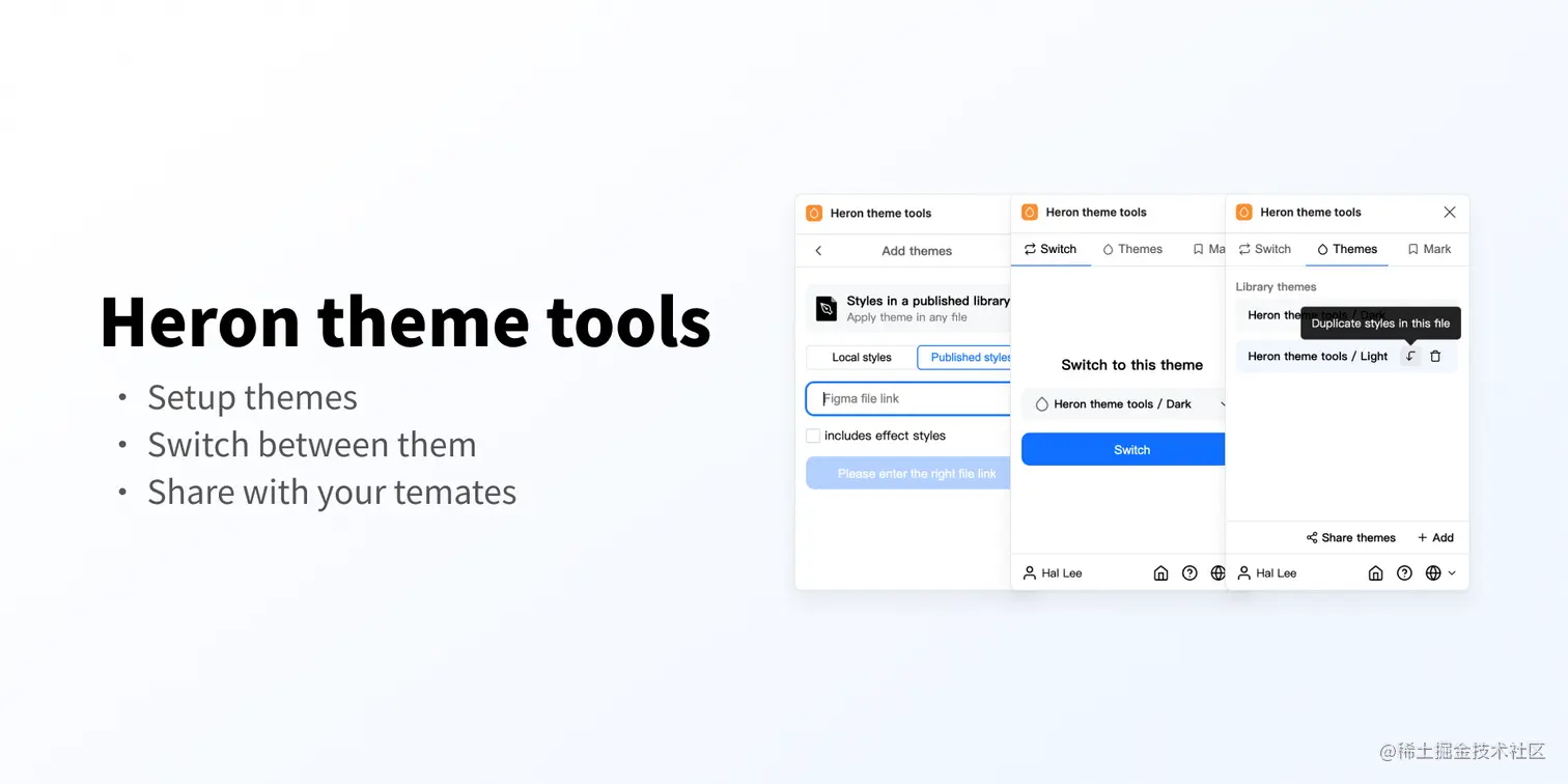 - Figma 主题切换插件 - 这是 @leadream4 开发的又一款优秀的插件,感兴趣可以看看 视频介绍,可以试用 3 天,现在七折促销中。主要功能:添加本地或远程样式为主题,快速切换主题,从一个主题复制样式生成新主题,分享主题给同事/朋友。这里购买。