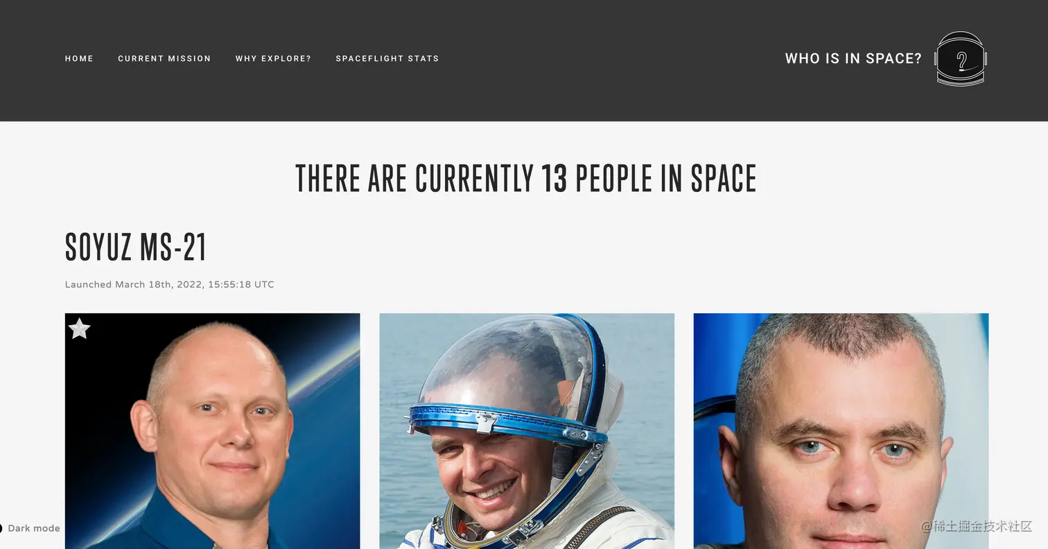 - Who is in space - 这个网站显示现在有多少人在太空,有多少个厕所在太空,有多少主动探索其他星球的机器人。