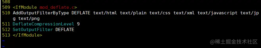 SetOutputFilter DEFLATE #代表启用deflate 模块对本站点的输出进行gzip压缩