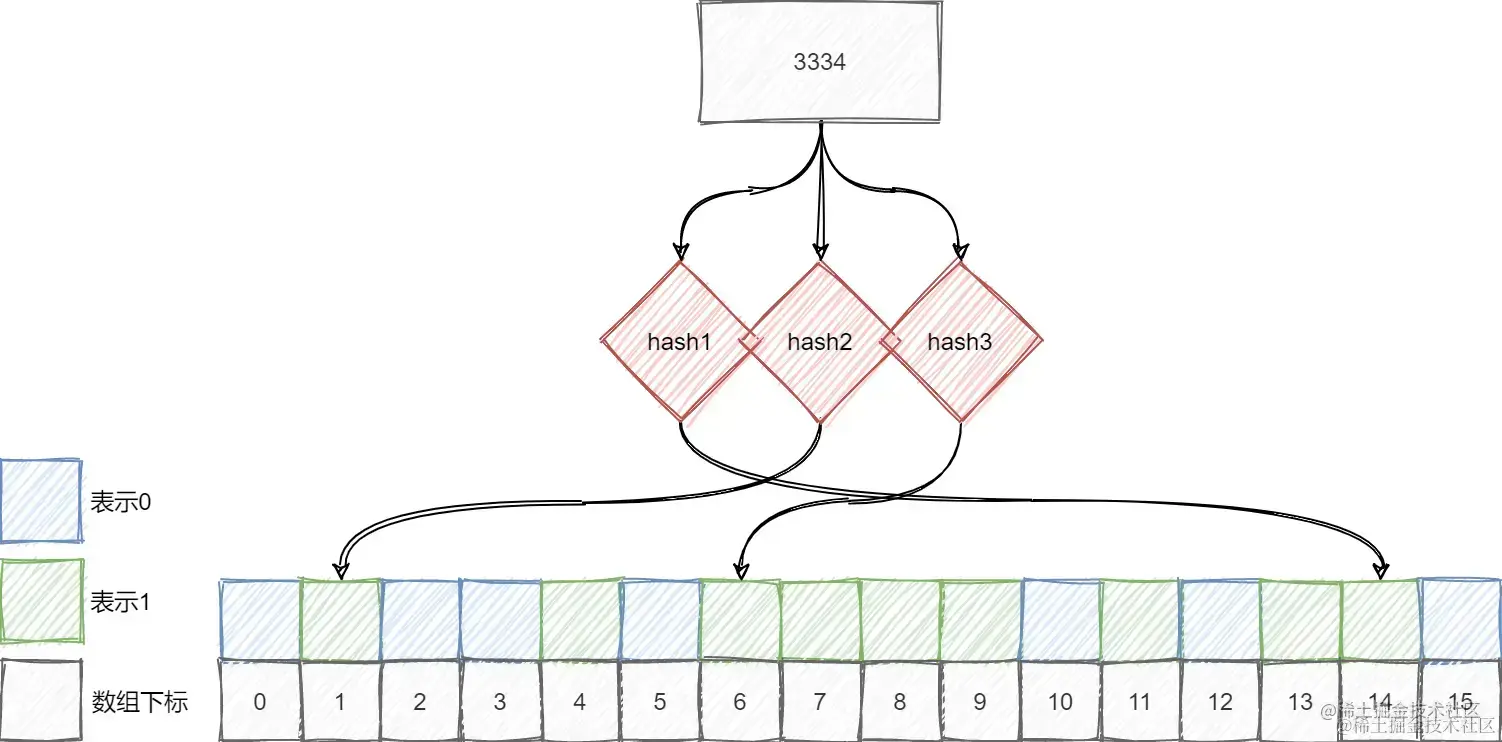 假设上图元素3334并没有加入集合,但是由于它映射的位置已经被其他元素所映射,则查询时会误判。