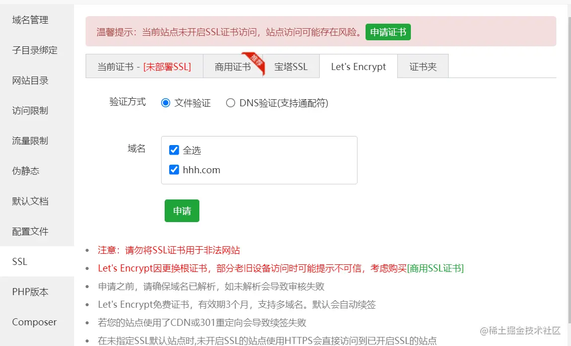 最后申请一下免费的证书和开启强制https就结束了(声明,没有hhh.com域名,只是随便输一个)