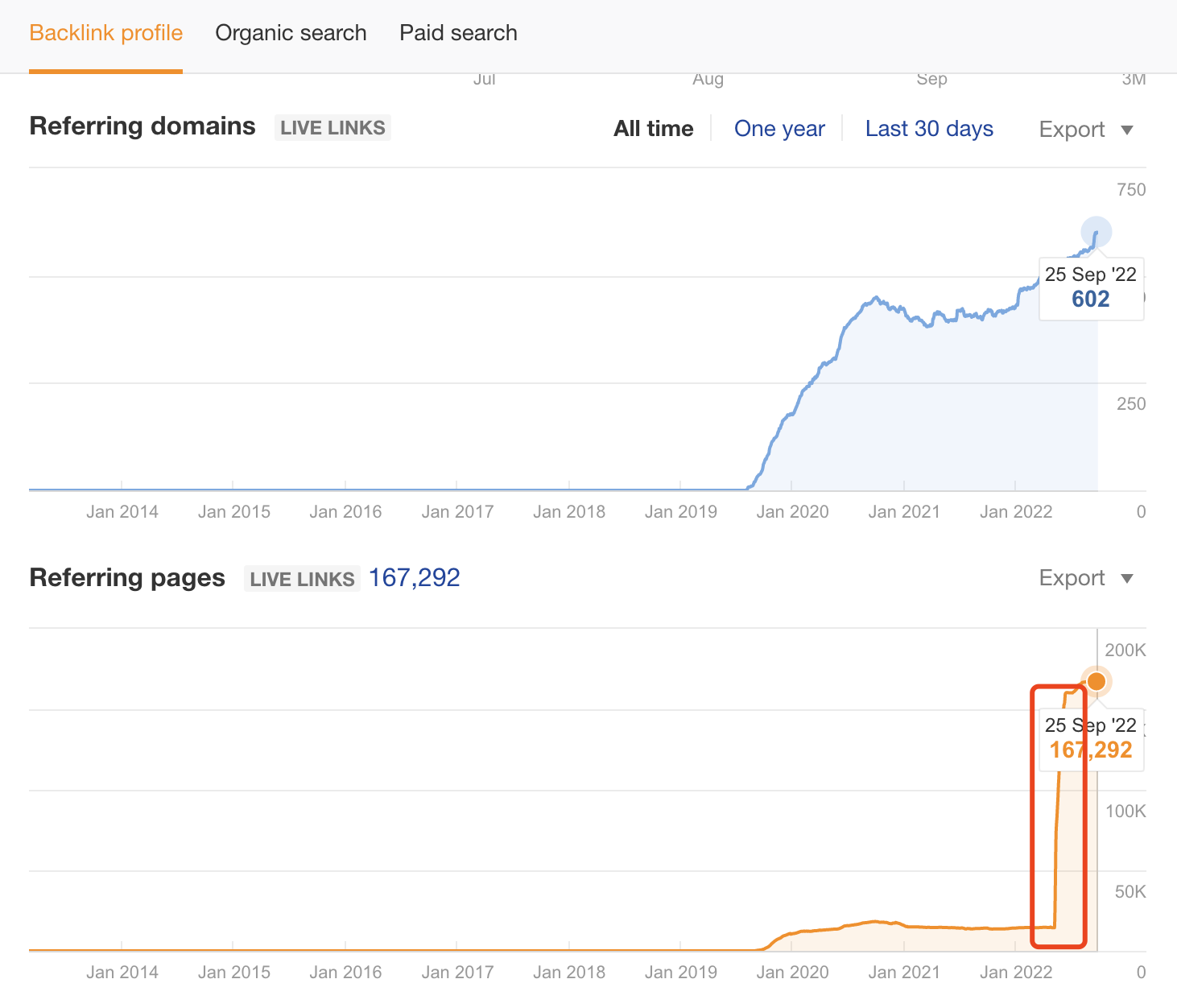 - 外链对应的域名增长。目前是 600 多个外部链接对应的域名