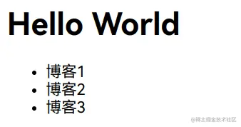 /src/index.js文件,将之前编写的数组变成ul元素插入页面中:const blogs = getBlogPosts(); const ul = document.createElement("ul"); blogs.forEach(blog => { const li = document.createElement("li"); li.innerText = blog; ul.appendChild(li); }) document.body.appendChild(ul); -
