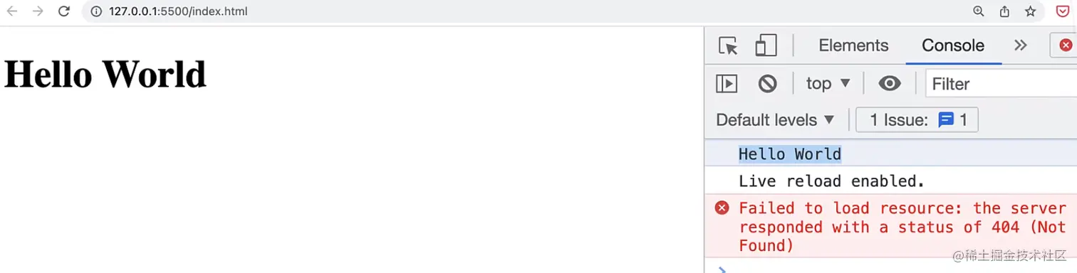 LiveServer查看刚刚所编写的 html页面:可以看到浏览器成功显示了 "Hello World",并且控制台也能够成功输出.
