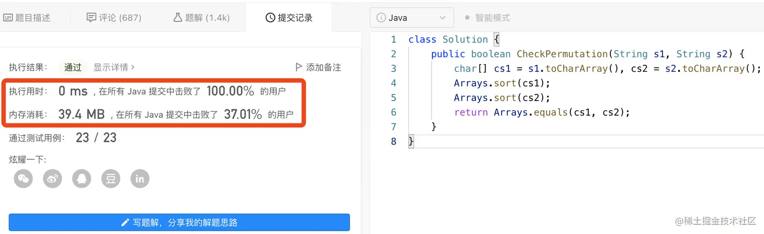 根据题意,我们将s1和s2都转化为字符数组cs1和cs2,并调用Arrays.sort(...)对其进行排序,排序后,我们就可以再通过调用Arrays.equals(...)方法来判断这两个字符数组cs1和cs2是否相同了。