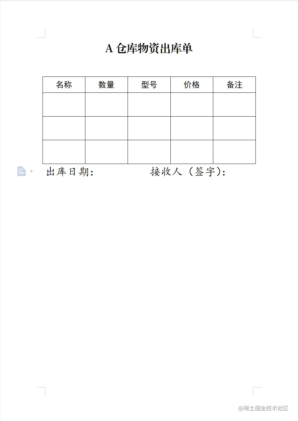 客户发来一份word文件,如图所示, 一个出库单的表格,要求做到他们的仓储管理系统里去,出库时自动填写表格,格式保持不变,可以在网页预览,也能下载PDF文件,然后打印出来签字。