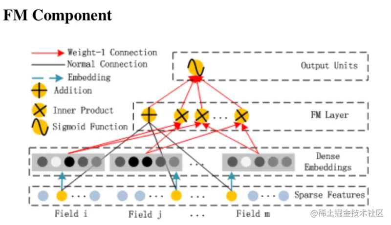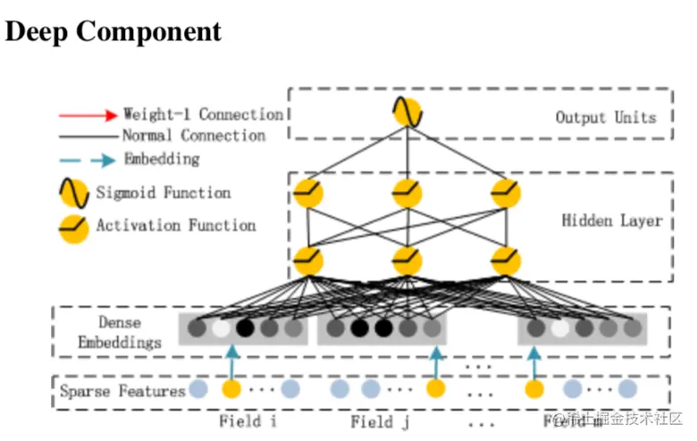 Wide部分就是一个FM,输入是N个one-hot的离散特征,每个离散特征对应到等长的低维(k)embedding上,最终输出的就是之前FM模型的output。并且因为这里不需要像IPNN一样输出隐向量,因此可以使用FM降低复杂度的trick。