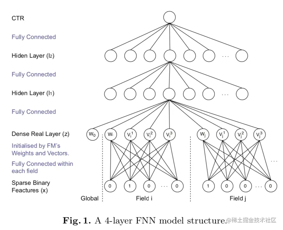 - FNN模型用和来初始化神经网络的第一层.模型输入是由特征离散化后的one-hot矩阵拼接而成(x),每个离散特征(i)的one-hot输入都映射到它的低维embedding上, 第一层是由