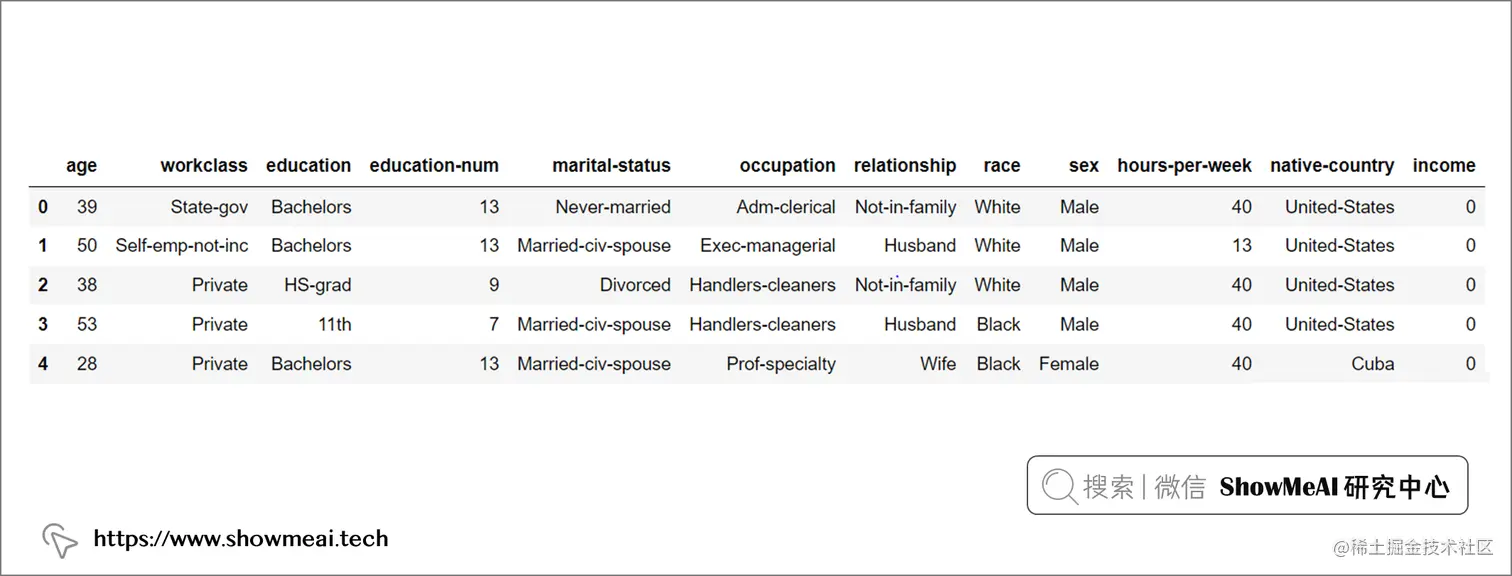 ShowMeAI在本例中使用到的是 🏆美国人口普查收入数据集,任务是根据人口基本信息预测其年收入是否可能超过 50,000 美元,是一个二分类问题。