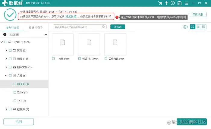 方法3:如果查找不到你要恢复的文件,可以选择“深度扫描“来查找更多的数据。由于搜索的内容比较多,所以需要等待一会。