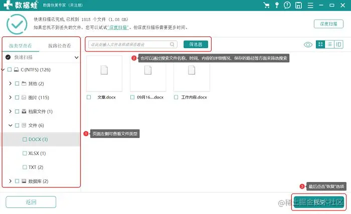 步骤2:得出扫描结果后,选择要恢复的文件。在页面左侧可以查看文件,也可以通过“筛选器”来精准寻找,提高查找的速度。最后点击“恢复”选项即可。
